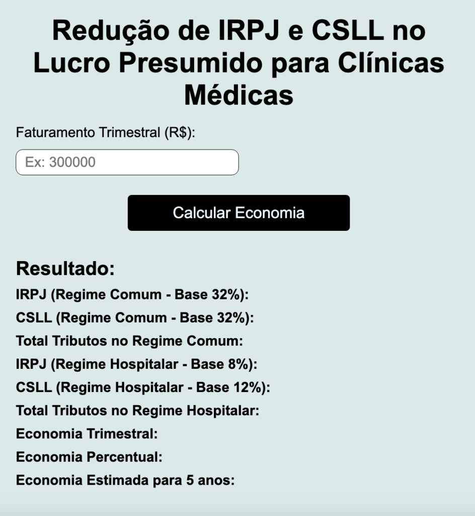 Permitir que clínicas médicas com estrutura hospitalar reduzam significativamente o valor pago de IRPJ e CSLL, no regime do Lucro Presumido, com base em percentuais menores de presunção.